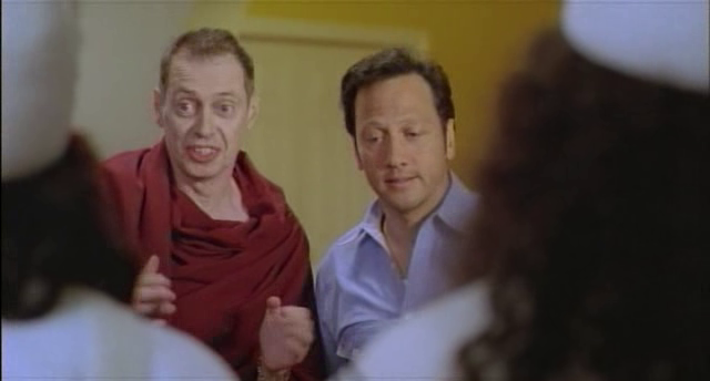 Paul welcomes the shamans and their guide-lady Marissa (Carolina Gomez) in his home to avoid them getting arrested and learns that he is The Chosen One that will save their tribe from extinction because something something something snow in the mountains. Paul, of course, wants nothing to do with saving the rainforest with these strange old dudes who sit cross-legged in his living room smoking pipes but he’s a desperate man whose life has bottomed out. It’s not like he’s got many options for betterment considering he’s spent the last day trying to off himself. What follows is pretty-by-the-book: Paul is constantly amazed by the weirdo shamans who follow him around everywhere, dump his booze out in the sink while he sleeps and pay for produce in the supermarket with sacred seeds. The shamans crash Schneider’s tense family supper, earning the ire of his gay Buddhist-monk brother (Steve Buscemi, of all people) who believes they’re a bunch of con-artists and not true spiritual men of God like him.