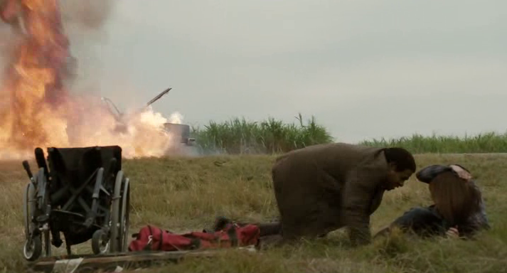 Our brave leads soldier on after obtaining a car from skeezeball Elias Koteas, who somehow ends up following them, putting the moves on Jane (citing that he, too, is crippled – crippled in his heart) and bailing with the car. They end up on a bus where Joey befriends a young woman (Madeline Zima) he thinks is an angel (her jacket has angel wings, you know, these things happens) whose husband has disappeared. They barrel through a series of clichés: they stop for a barbecue, watch some sweet fireworks, go to a diner for apple pie, have a yelling match by the side of the road… (As an aside, they have an extremely lax schedule here; who leaves for a specific date with seven fucking days to spare?)