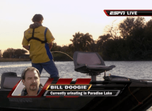 Bill Dugan (Bill Engvall, one of the Blue Collar Comedy Tour dudes who isn’t Larry the Cable Guy or Jeff Foxworthy and shares a striking resemblance to Brian Cox) loves fishing so much he dreams about it. He even owns a small bait shop that seems to barely break even, considering his client base includes two old cronies (Richard Riehle and Wilbur Houston), a layabout handyman who never seems to do anything (Christopher Schmidt) and a penniless conspiracy nut (Rus Blackwell) . His only employee is trying to save the bait shop by diversifying, which drives Bill up the wall. Clearly, selling worms to invisible patrons should be easily sustainable! His father-in-law (Harve Presnell) wants him to sell the bait shop and get a real job. A hotshot professional fisherman named Hot Rod Johnson (Cyrus) is opening a bait shop full of newfangled doodads right across the street from Bill’s shop and impressing Bill’s teenaged son with all his money, eventually taking him on as a protégé. Balloon payments on his mortgage put him 15,000 dollars in debt and the only way to make that money is to win a big fishing tournament against Hot Rod. In other words, his life is fraught with all kinds of delightful odds to overcome in the next hour and twenty minutes.