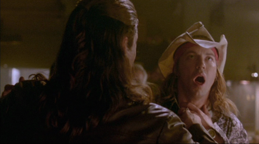 As with every crime film made in the 90’s, No Code of Conduct begins extreme close-ups of somebody preparing drugs under stroboscopic lighting. In this case, it’s a long-haired sleazebag by the name of Willdog (Joe Lando) rolling a joint as prepares to join a motley crew of colorful criminals in making a Mexican drug mule puke in the back room of his nightclub. The operation turns out to be a bust when one of the would-be criminals (Michaels himself, bedecked in his Mickey Rourke / gay-cowboy-on-LSD Sunday best) turns out to be an undercover cop. They rip his fucking throat out, the Mexicans get the hell out of there and our dope-dealing heroes are left heroin-less, which is a terrible way to be when you’re a heroin dealer.